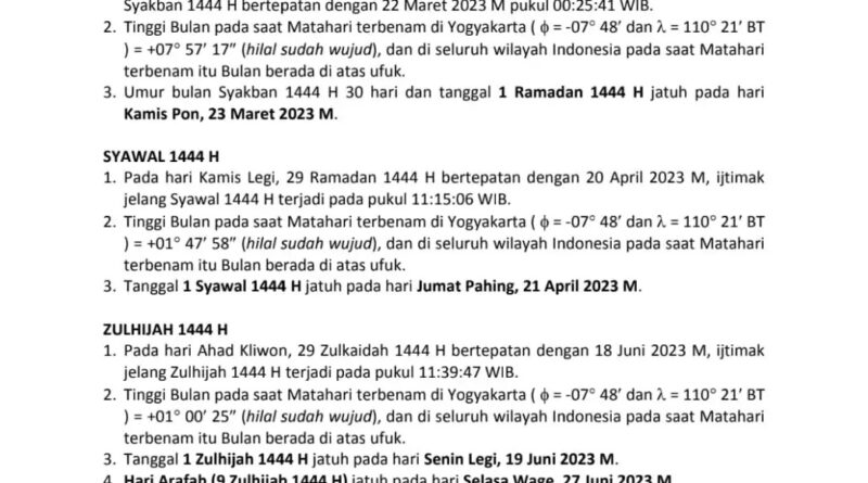 - Tanggal 1 Zulhijah 1444 H jatuh pada hari Senin Legi, 19 Juni 2023 M.