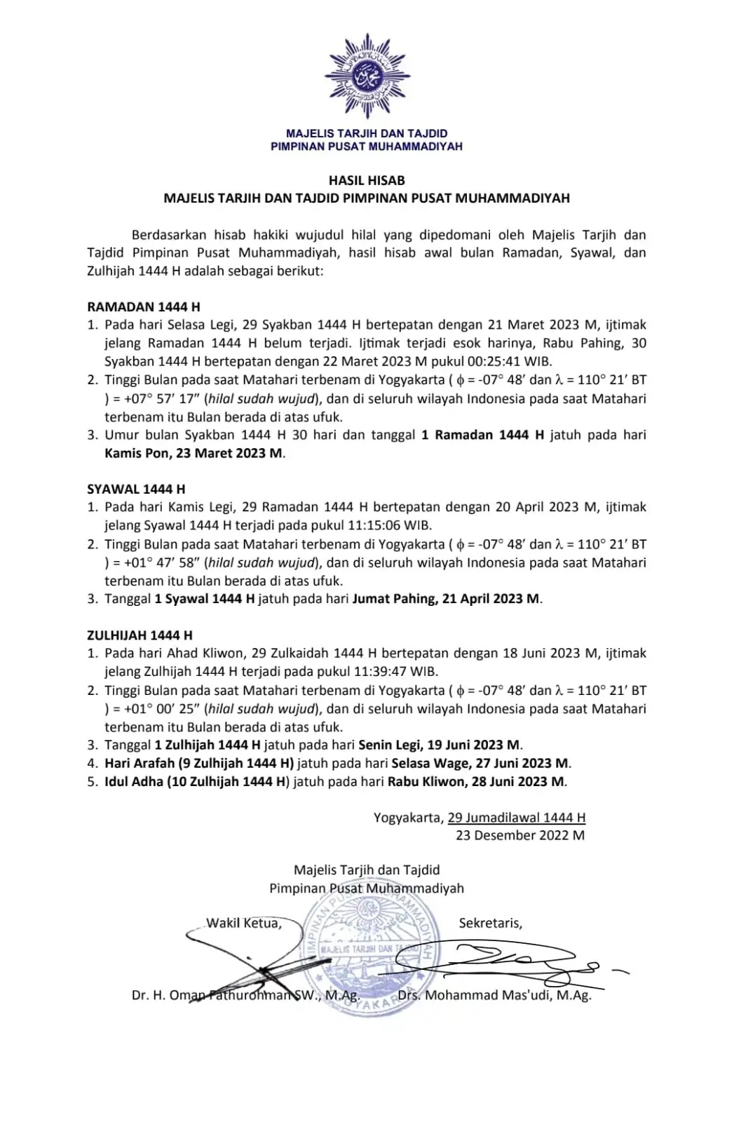 Berdasarkan surat edaran yang diterbitkan oleh Majelis Tarjih dan Tajdid Pimpinan Pusat Muhammadiyah yang keluar pada 29 Jumadilawal 1444 H bertepatan 23 Desember 2022 M sebagaimana ditandatangani oleh Wakil Ketua Dr H Oman Fathurohman SW, MAg dan Sekretaris Drs Mohammad Mas’udi, MAg memutuskan hasil sebagai berikut.