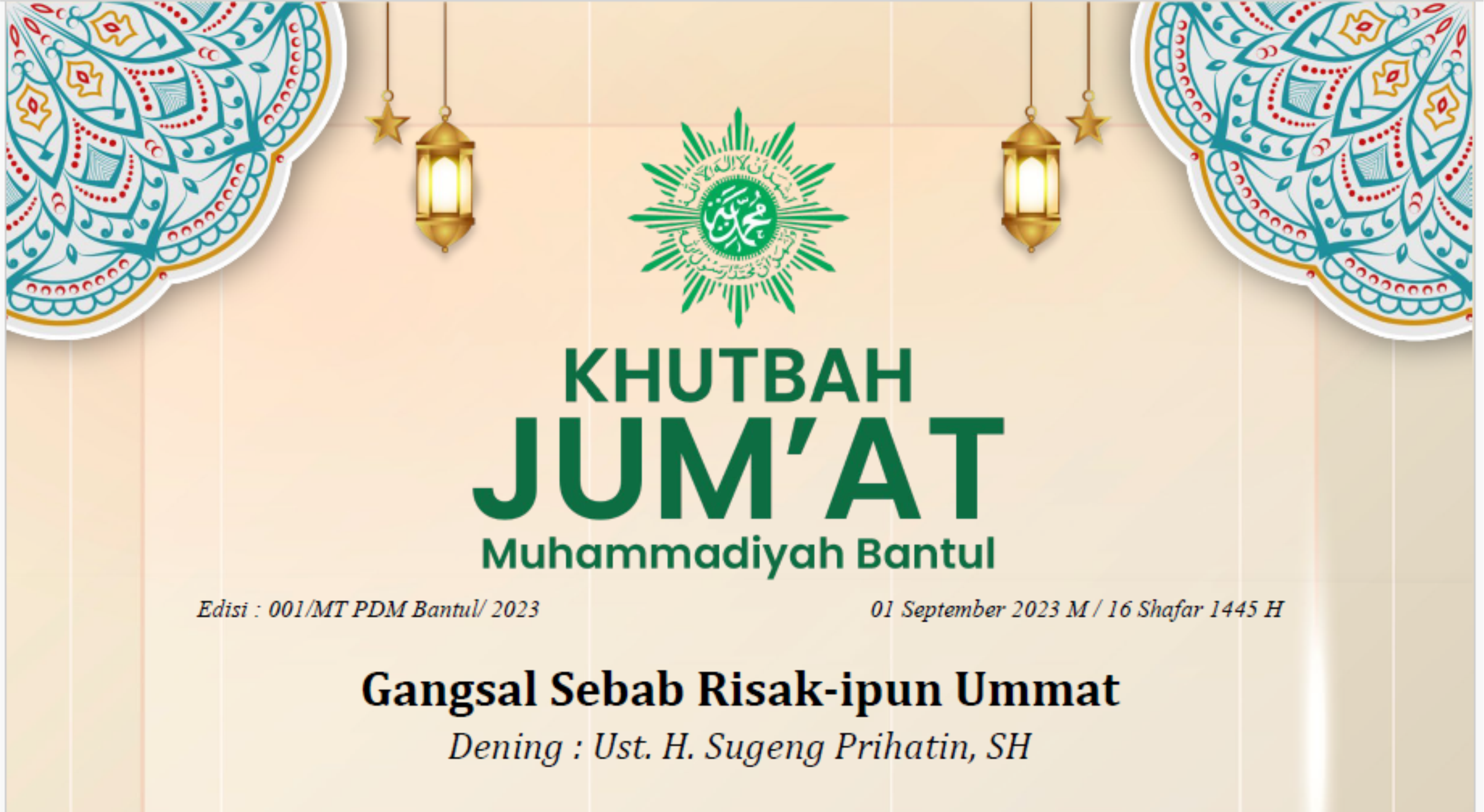 Saklajengipun kula ngajak dumateng awak kula, minggahipun dumateng para Jama’ah, mangga kita ningkat-aken iman lan taqwa kita dumateng Allah SWT, kanthi nindak-aken dhawuh-dhawuhipun Allah SWT, saha nebihi menapa ingkang dados awisanipun