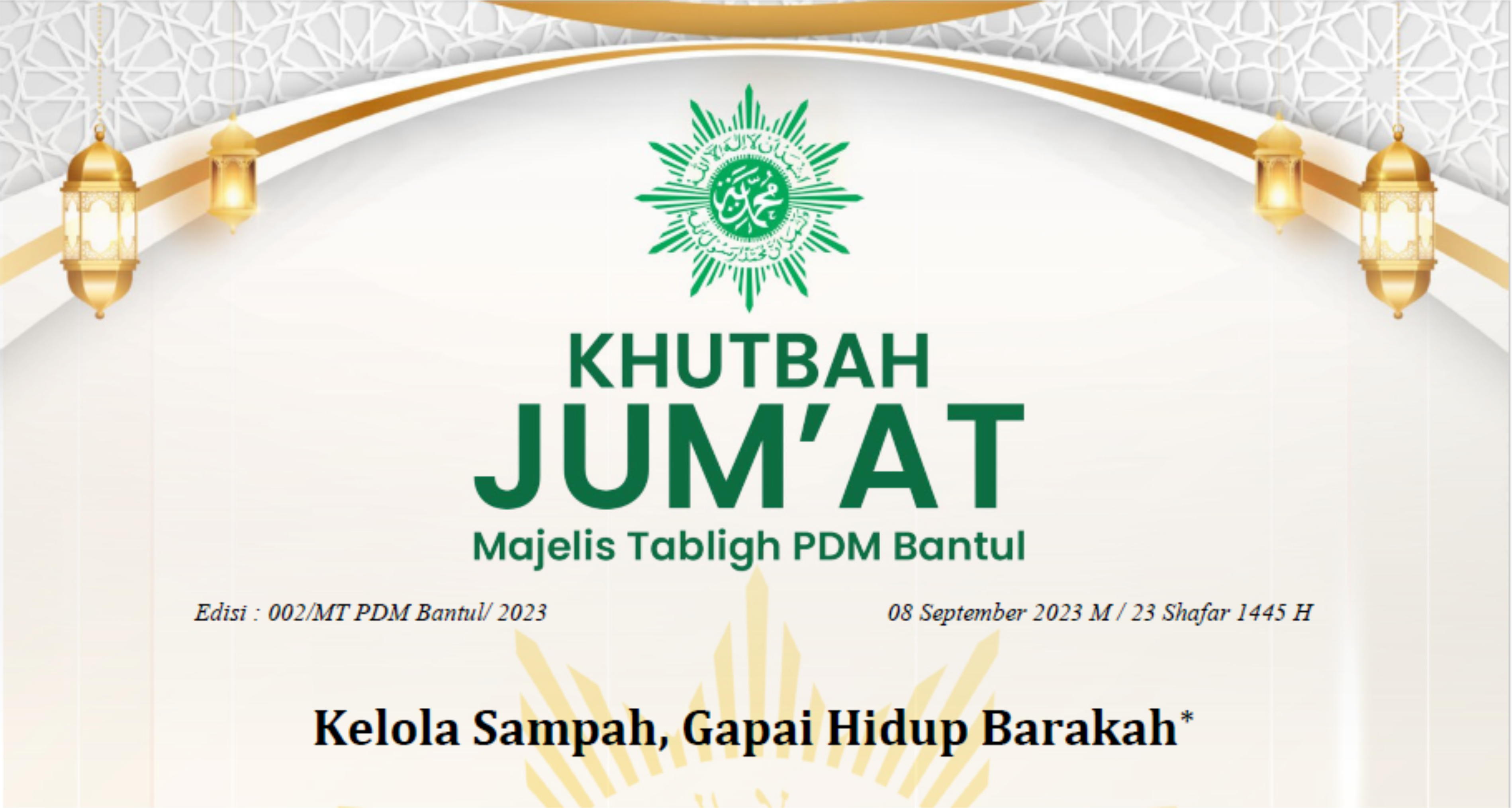 Termasuk salah satu implementasi taqwa adalah menjaga kelestarian lingkungan hidup, khususnya kesadaran dalam mengelola sampah. Mengapa khatib memilih topik ini? Karena Islam sebagai diin yang Syamiil (menyeluruh), Kamiil (sempurna), dan Mutakammil (menyempurnakan), sangat memperhatikan terhadap pelestarian lingkungan. Islam membangkitkan kesadaran bagi umatnya untuk menyayangi lingkungan, yaitu segala sesuatu yang berada di sekitar manusia, baik makhluk hidup maupun benda mati. Bahkan Rasulullah SAW bersabda: