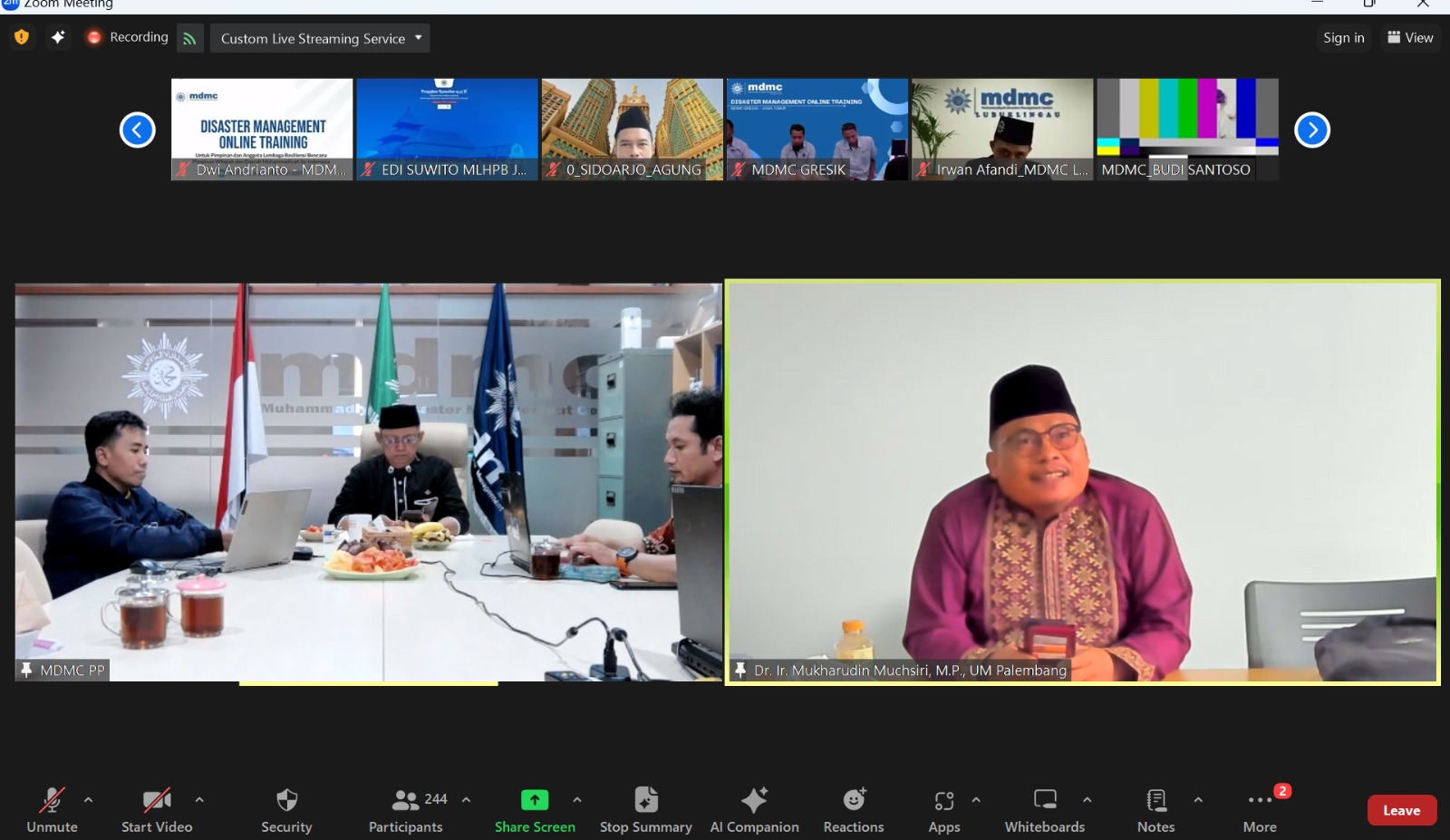 Yogyakarta (2/2) – Muhammadiyah Disaster Management Center (MDMC) selenggarakan kegiatan “Disaster Management Online Training” pada tanggal 2 – 3 Februari 2024 untuk MDMC wilayah se-Indonesia. Hadir memberikan sambutan Wakil Rektor 3 Universitas Muhammadiyah Palembang, Dr. Ir. Mukharudin Muchsiri., M.P., sebagai perguruan tinggi yang mendukung kegiatan ini.
